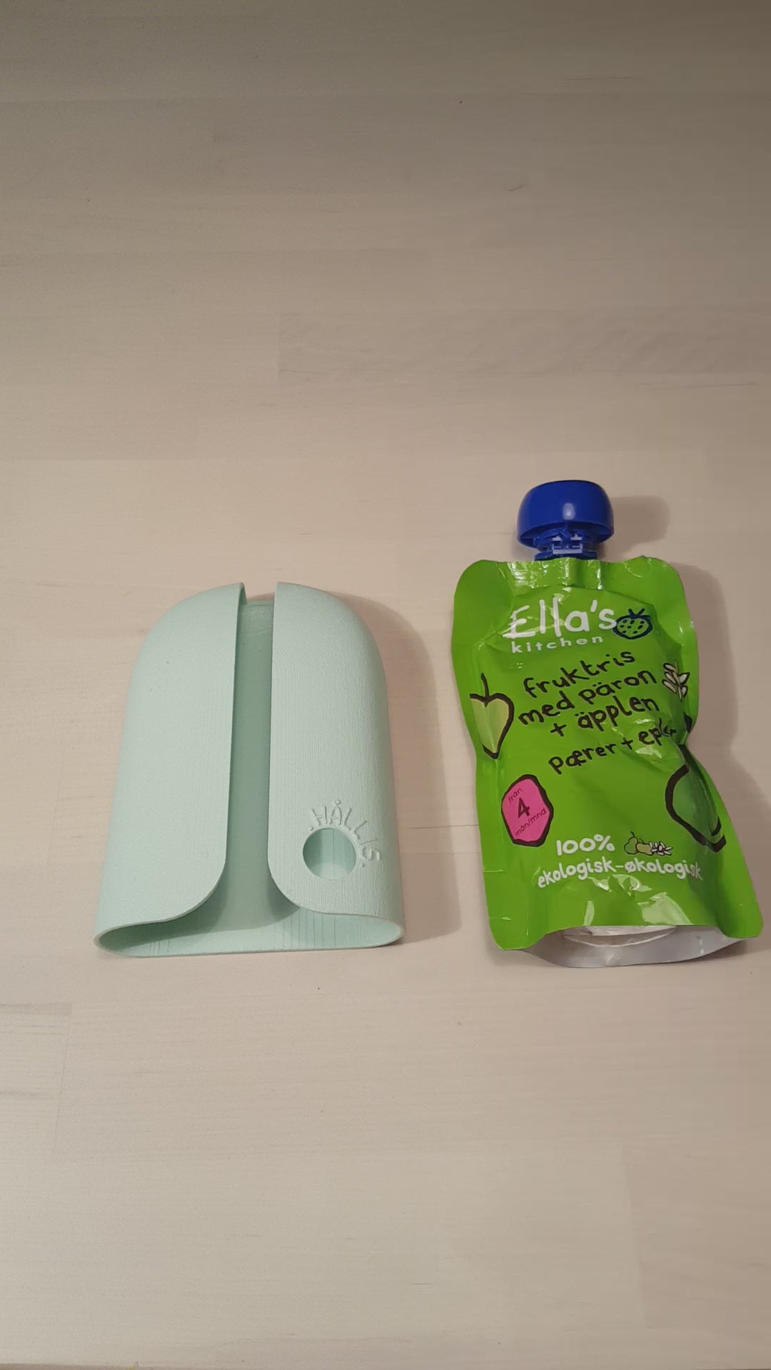 The Squeeze pouch holder is a smart little protection that prevents children from pressing too hard on the squeeze pouch. The easy-to-grip holder is easily placed around the cap and fits the vast majority of squeeze pouches you find in the store. When the holder is on the squeeze pouch, the child can still suck out the food pouch, but the holder prevents it from pressing too hard on the bag. It reduces the risk of the contents spilling over and you don't have to dry clothes, car seats and the stroller from oatmeal, yogurt, smoothies and other baby food. It fits most squeeze pouches on the market, it can also be used for most reusable squeeze pouches.